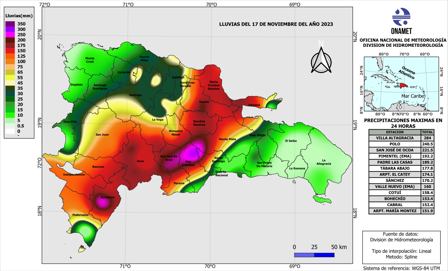 According to figures provided by Oficina Nacional de Meteorologia (ONAMET) in a 24-hour period to 17 November 2023, Villa Altagracia recorded 284.5 mm, Polo in Barahona saw 240.5 mm (Barahona) and San José de Ocoa recorded 221.5 mm.