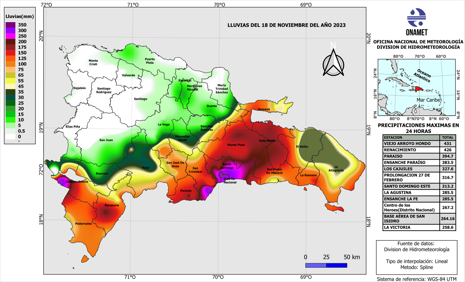 In the following 24-hour period, the weather station at Arroyo Hondo Viejo in the National District recorded a record 431 mm. Significant totals were also recorded in the Renacimiento neighbourhood in Santo Domingo (426 mm) and in Paraiso in Barahona Province (394.7 mm) during the same period.