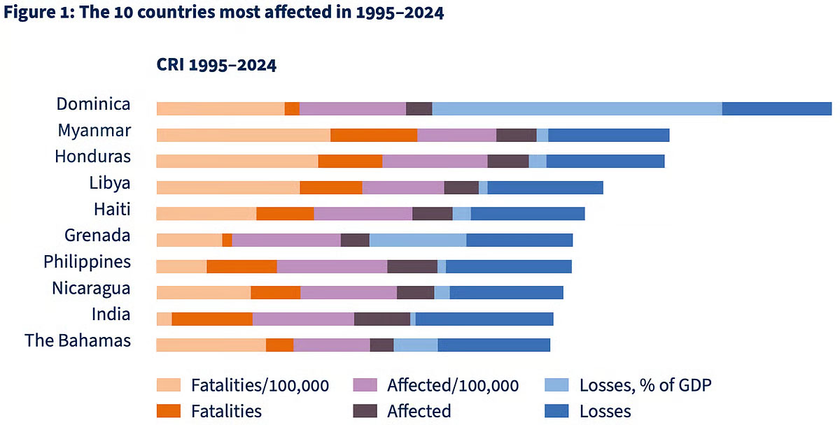 Dominica tops the long-term ranking (1995-2024), followed by Myanmar, Honduras, Libya, Haiti, Grenada, the Philippines, Nicaragua, India, and the Bahamas, according to the CRI 2026. For 2024 alone, the countries most affected were St Vincent and the Grenadines, Grenada, Chad, Papua New Guinea, Niger, Nepal, the Philippines, Malawi, Myanmar, and Vietnam, many of them small island or low-income states.