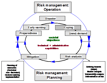 From the flood manager’s point of view,floods are considered from a multi-dimensional perspective, as part of the risk management cycle shown in Fig.1, and range from planning to implementation and to operation. The cycle has two semi-circles: the top one, which covers the aspects of operating an existing system to prevent a disaster from happening, and the bottom semi-circle, which covers the activities associated with the design or improvement of a flood protection system, including risk assessment and project planning. Flood risk management sees floods as: