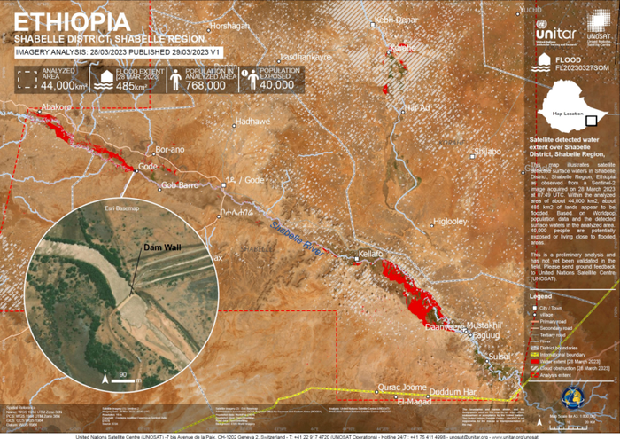 Images provided by the United Nations Satellite Centre UNOSAT showed flooding along the Shabelle River in Shabelle District. As of 28 March 2023, as much as 485 km2 of land was under water, with an estimated 40,000 people exposed to floodwaters.