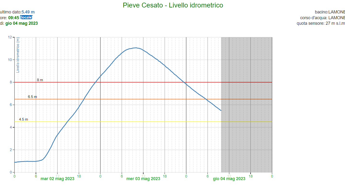 Levels of the Lamone River near Pieve Cesato, Province of Ravenna jumped from around 1 metre early on 02 May to over 11 metres by early 03 May, according to data from Arpae Emilia-Romagna.