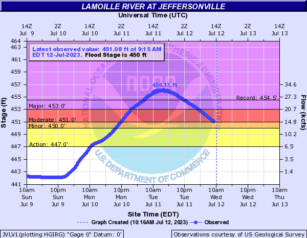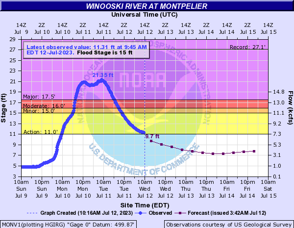 River levels increased, most dramatically the Winooski River at Montpelier, capital city of Vermont. The river jumped by over 14 feet in the space of 20 hours on 10 July. The Winooski finally crested at 21.25 feet, well above Major Flood Stage of 17.5 feet, early on 11 July. Levels have since fall to below Minor Flood Stage. As of 12 July the Winooski River at Essex Junction remained above Major Flood Stage.
