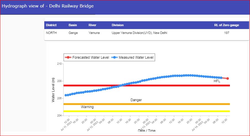 According to figures from CWC, the Yamuna River at Delhi Railway Bridge stood at 208.48 metres as of 13 July 2023. This is the highest level on record, beating the previous high of 207.49 set in September 1978. The danger level at this section of the river is 205.33 metres.