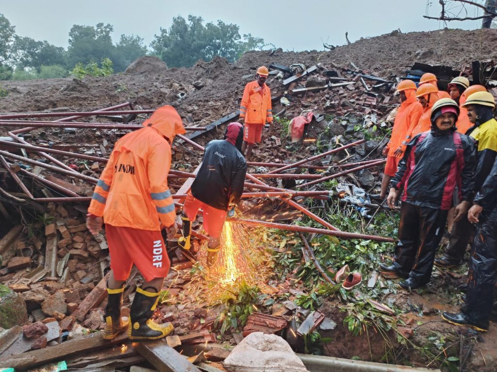 The heavy rain in Raigad district triggered a massive landslide in the village of Irshalwadi, burying as many as 40 homes, the district collector said. Emergency teams have been searching through the debris throughout the day. Almost 100 people have been rescued from the site. As of late (local time) 20 July, 12 bodies had been located. Adding to the tragedy, one of the rescue workers suffered a cardiac arrest and died at the rescue site.