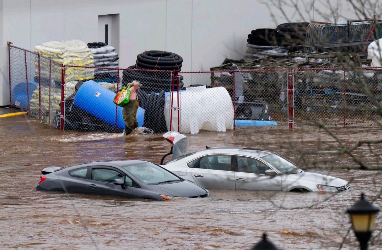 A man walks past cars abandoned in floodwaters in Halifax, Nova Scotia, Canada, on July 22, 2023. | Darren Calabrese / The Canadian Press via AP