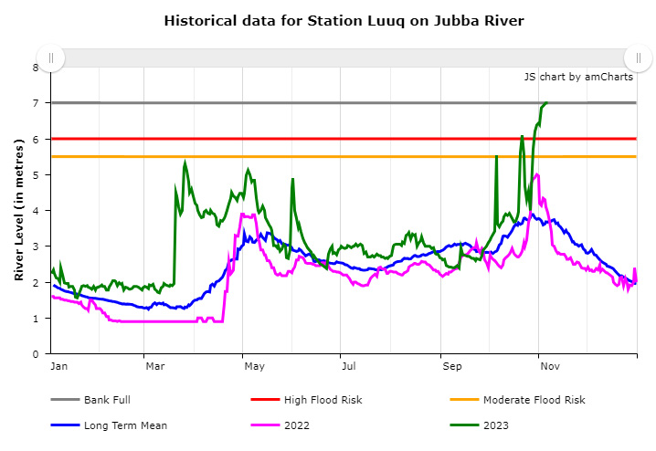 “South West and Jubaland states are the worst affected, with an estimated 268,243 and 268,365 people affected, respectively. In Hirshabelle, at least 145,800 people are reportedly affected, with 11,700 displaced following heavy rains on 05 November. Up to 400 families (2,400 people) are believed to be trapped by floods in Luuq and efforts are ongoing to urgently evacuate them. In Baardheere, local authorities are appealing for urgent support for more than 14,000 families that have been cut off from the main town and are unable to replenish their domestic supplies,” UN OCHA said.