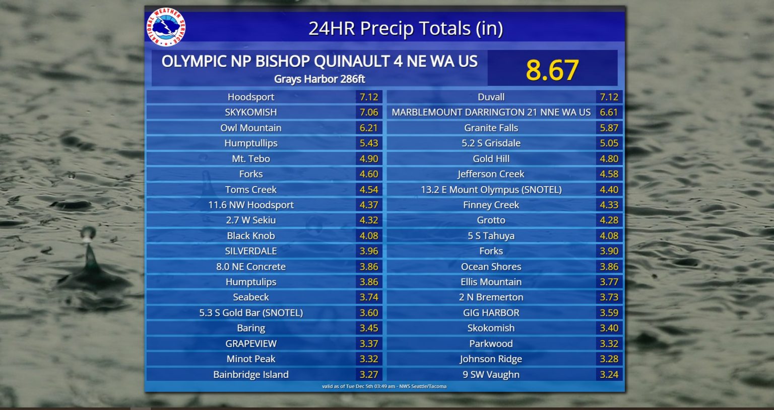 The National Weather Service (NWS) in Seattle reported significant rainfall totals in various parts of Western Washington, including the Olympic National Park which recorded 8.67 inches / 220.22 mm of rain in 24 hours to 05 December 2023. Weather stations at Hoodsport and Duvall both recorded 7.12 inches / 180.85 mm during the same period.