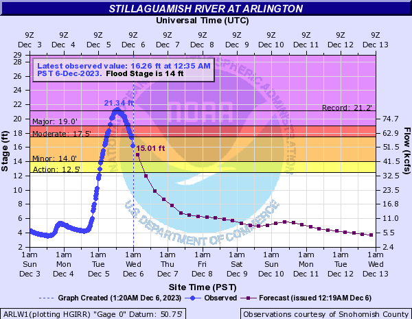The Stillaguamish River reached a record high of 21.34 feet / 6.50 metres at Arlington on 05 December, beating the previous high of 21.16 feet / 6.44 metres reached in 2010.
