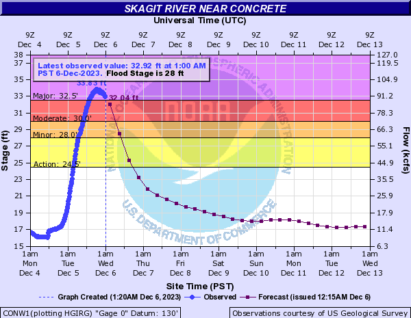 As of 05 December, the Skagit River was above Major Flood stage near Concrete. The Snohomish, Snoqualmie, Skokomish and Cowlitz were above Moderate Flood Stage in several locations.