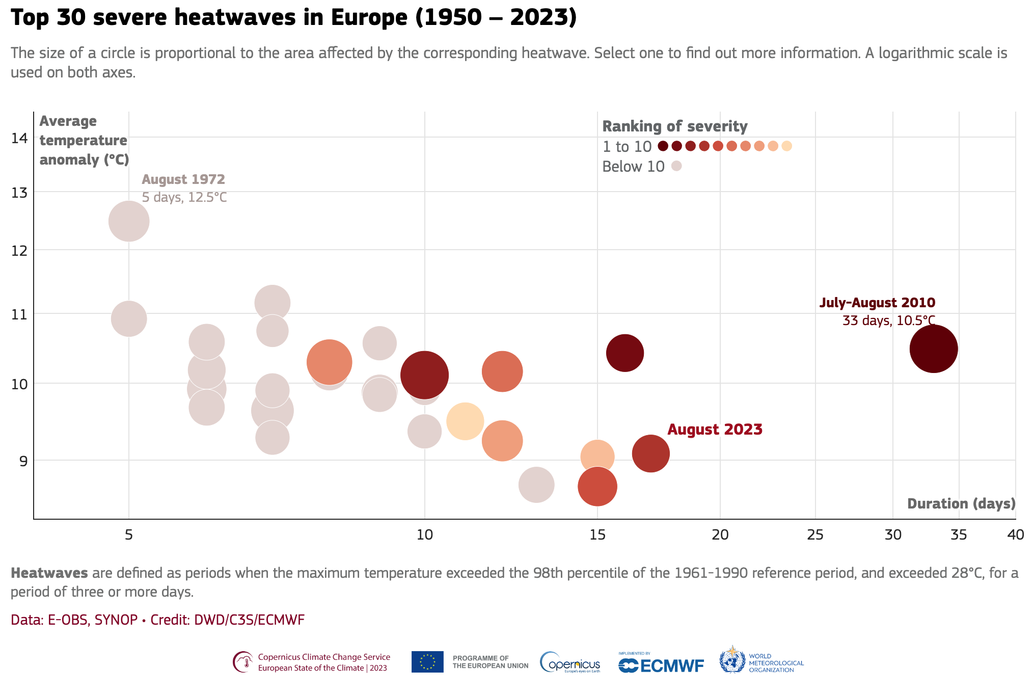 The 30 most severe heatwaves in Europe, 1950–2023. The size of a circle is proportional to the area affected by the corresponding heatwave. Heatwaves ranked as more severe are indicated by darker colours, and grey indicates those with a ranking of severity below 10. Source: DWD. Credit: DWD/C3S/ECMWF.