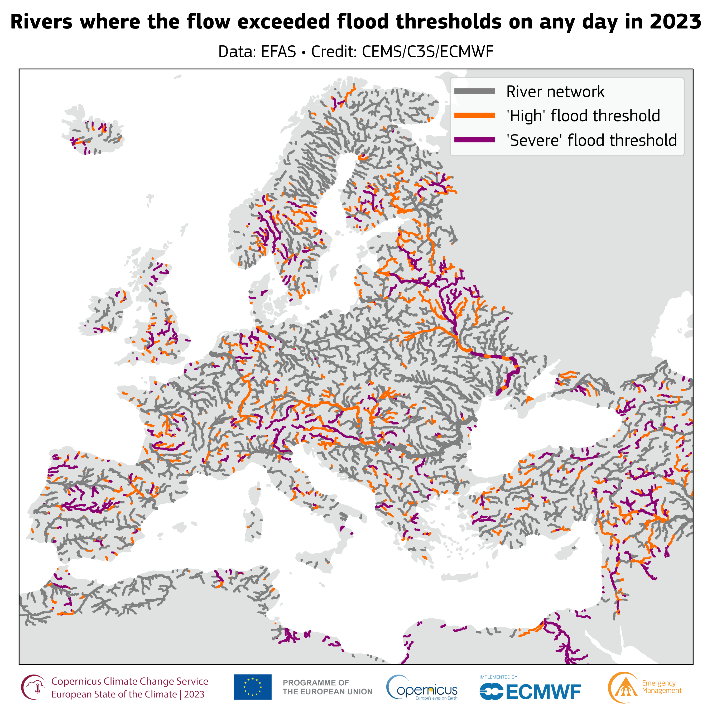 Record or near-record high river flows were seen in major river basins, including the Loire, Rhine, and Danube, due to a series of storms between October and December. According to preliminary estimates from the International Disaster Database (EM-DAT), flooding in 2023 affected an estimated 1.6 million people in Europe and caused around 81% of the year’s economic losses due to weather and climate-related events on the continent.