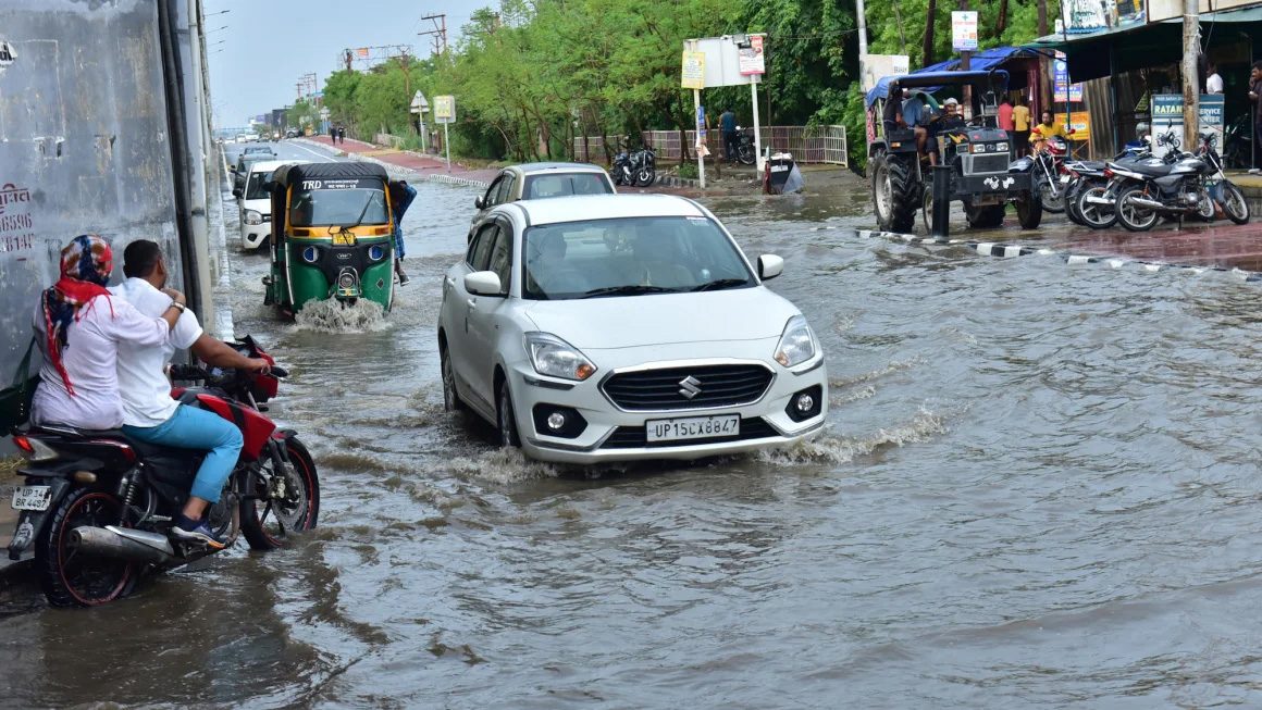 Commuters wade through a waterlogged road during monsoon rainfall at wave city NH9 on June 29, 2024 in Ghaziabad, India. Sakib Ali/Hindustan Times/Getty Images