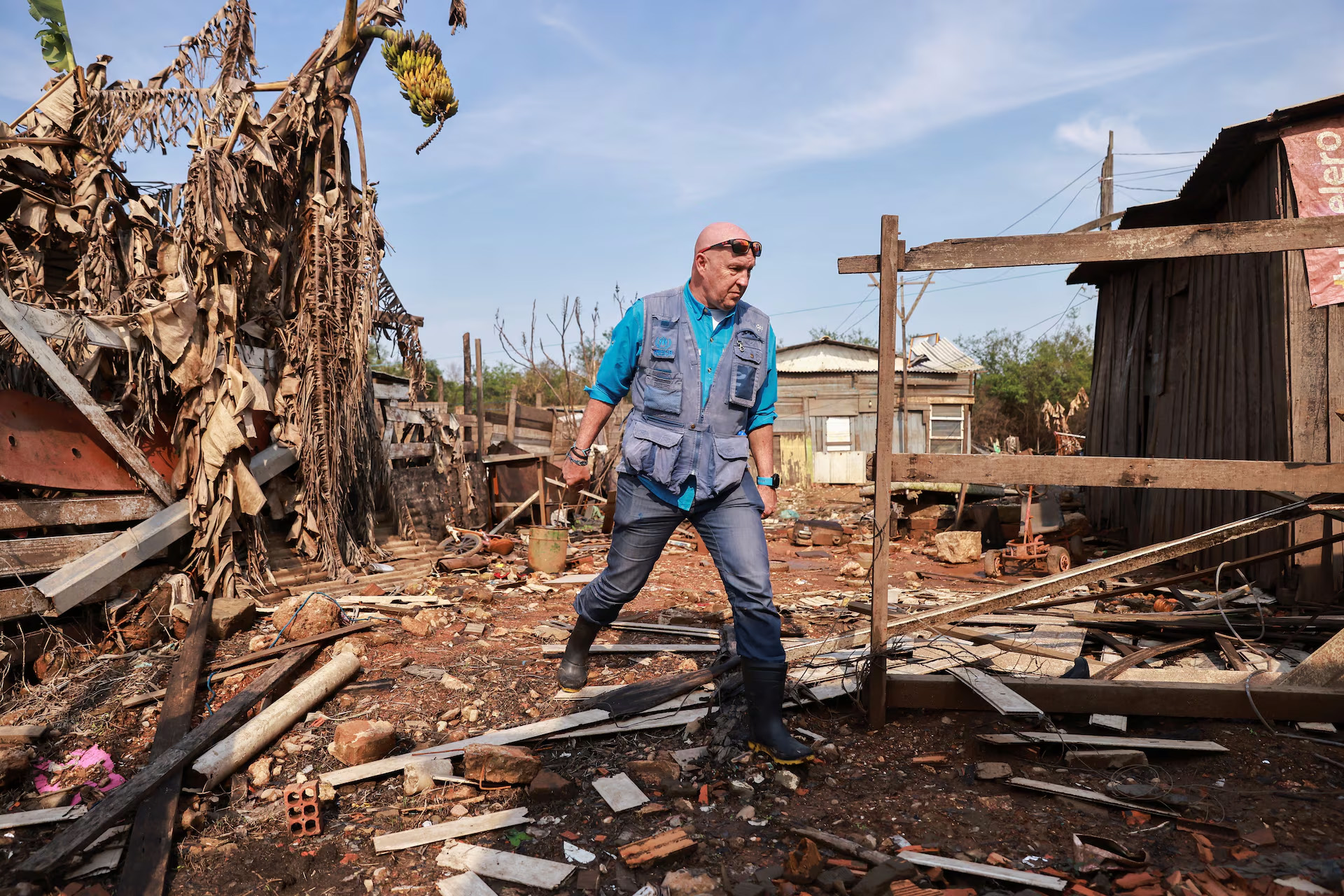 Andrew Harper, climate advisor for the UN refugee agency (UNHCR), looks on during a visit to a neighborhood partially destroyed by the floods that hit Porto Alegre, in the state of Rio Grande do Sul, Brazil, June 23, 2024. REUTERS/Diego Vara