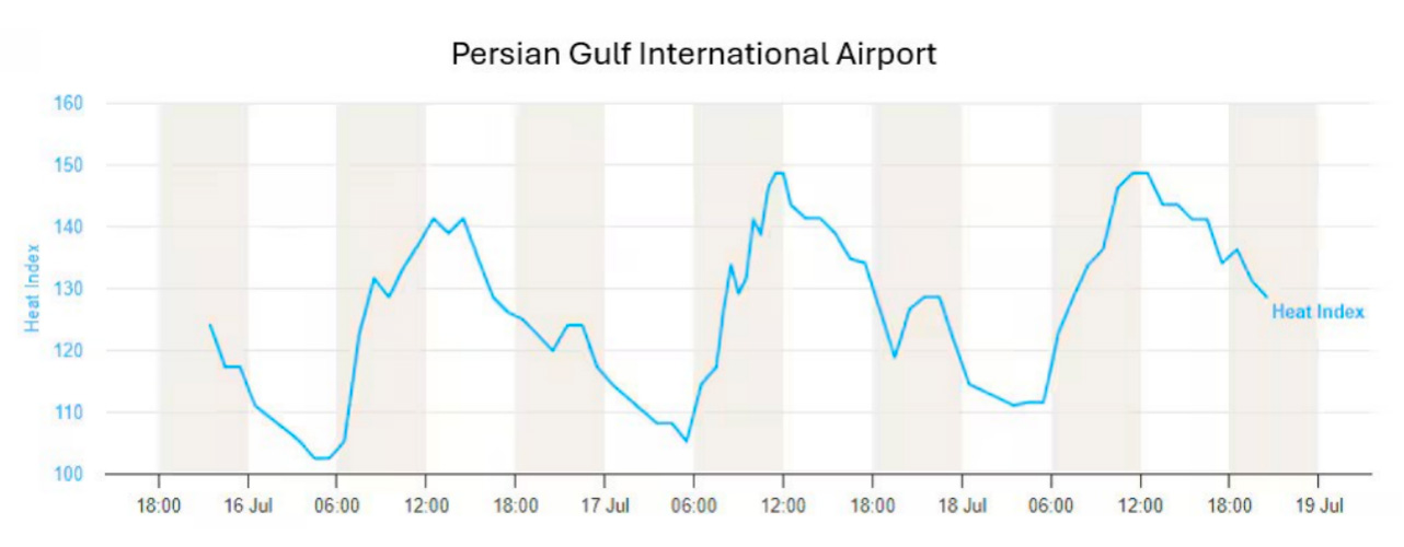 A Washington Post analysis found that the wet-bulb globe temperature, which measures the amount of heat stress on the human body, reached 96 (36 C) at the Persian Gulf International Airport and 95 (35 C) in Dubai, exceeding the threshold of 89.6 (32 C) that researchers have said poses a risk to human survival if such heat is prolonged. The wet-bulb globe temperature, which was calculated using data from nearby weather stations, takes into account a combination of temperature, humidity, wind and clouds.