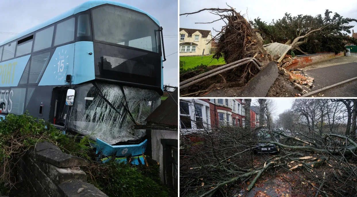 Two people were killed on Saturday as Storm Darragh hit the country with wind speeds of up to 93mph, causing widespread travel disruption and leaving tens of thousands of homes without power.
