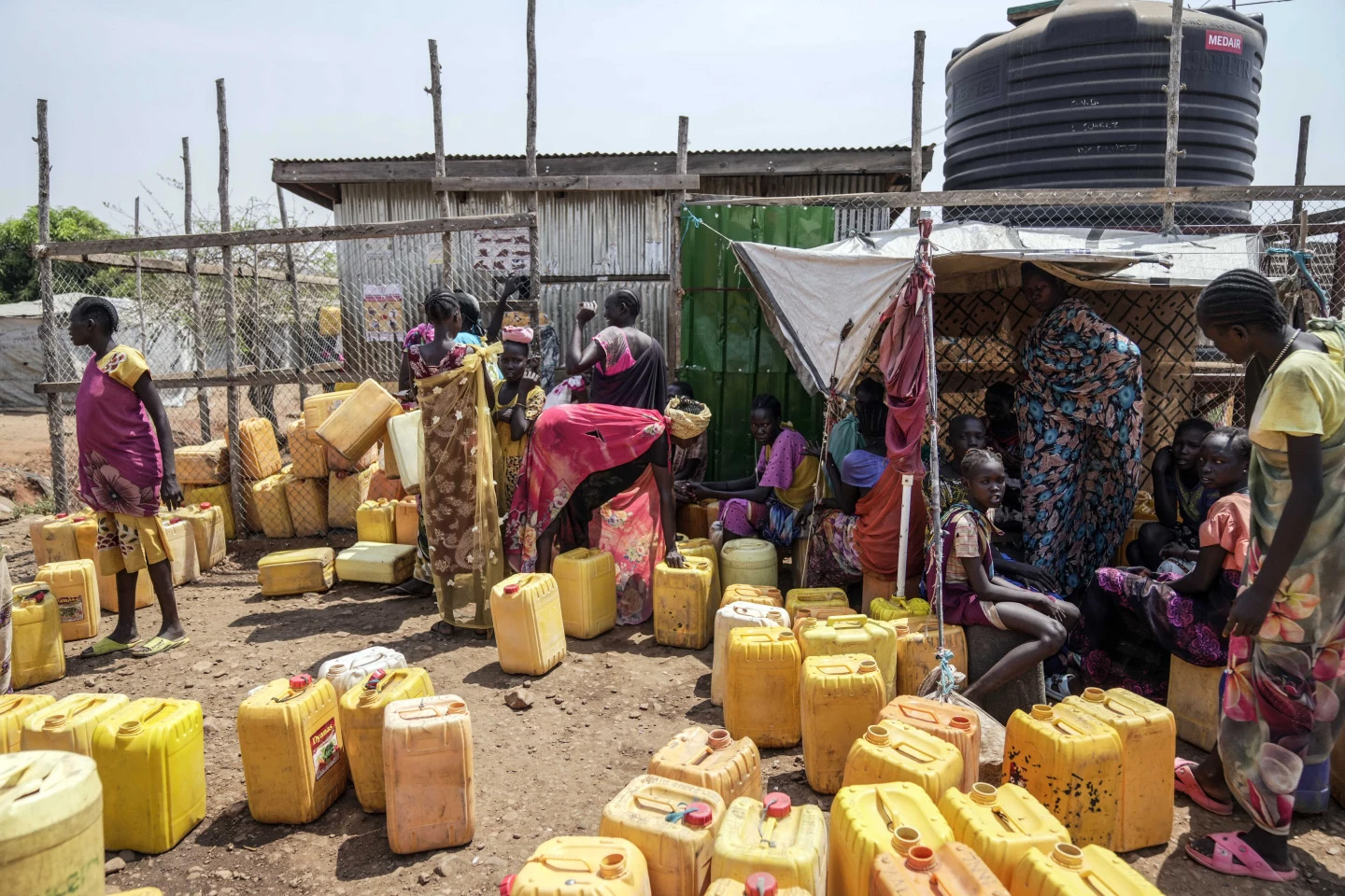 IDP (Internally Displaced Person) fetch water inside a camp in the outskirts of Juba, South Sudan Thursday, Feb. 13, 2025. (AP Photo/Brian Inganga)