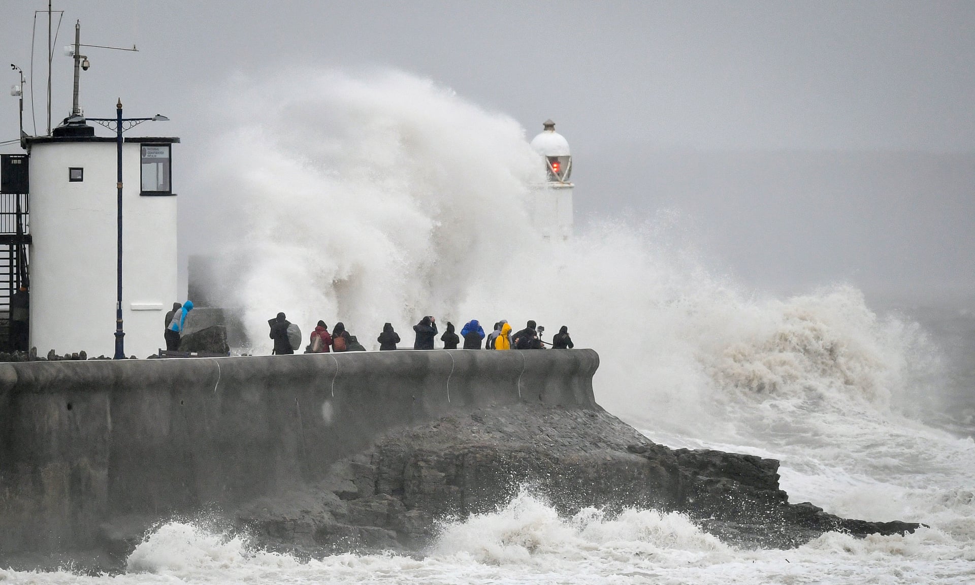 As the so-called bomb cyclone battered the coastline, as much as a month’s worth of rainfall was predicted overnight and into Sunday morning in some parts of the UK.