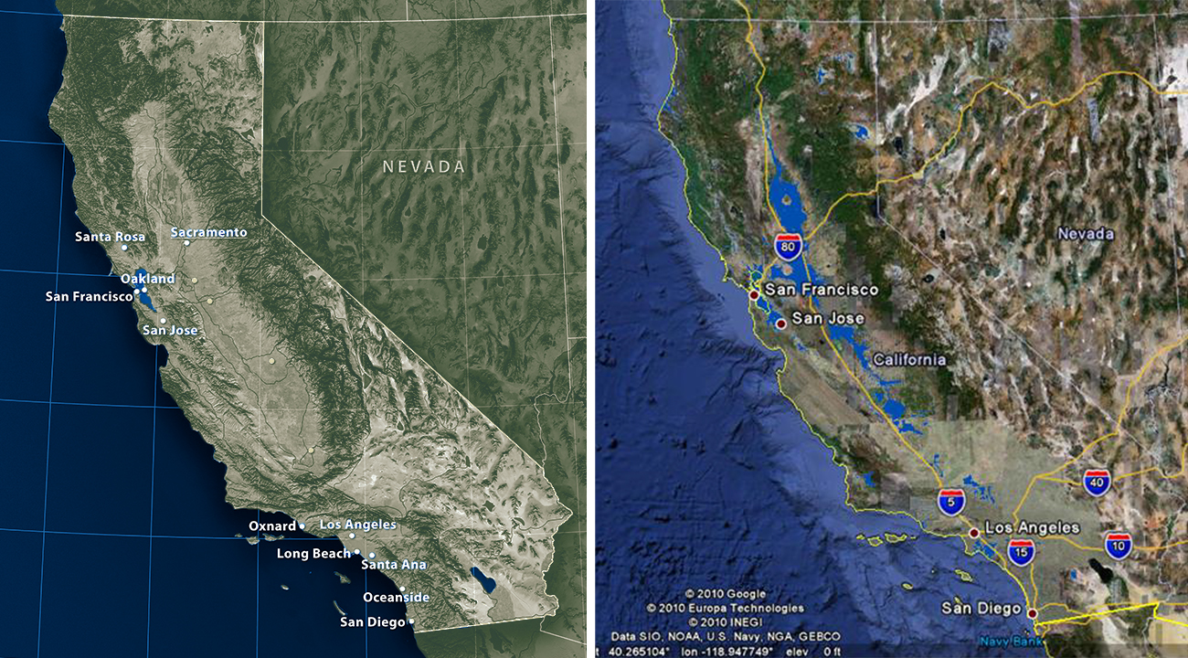 In their model, 25 days of relentless rains overwhelm the Central Valley’s flood-control infrastructure. Then large swaths of the northern part of the Central Valley go under as much as twenty feet of water. The southern part, the San Joaquin Valley, gets off lighter; but a miles-wide band of floodwater collects in the lowest-elevation regions, ballooning out to encompass the expanse that was once the Tulare Lake bottom and stretching to the valley’s southern extreme. Most metropolitan parts of the Bay Area escape severe damage, but swaths of Los Angeles and Orange Counties experience “extensive flooding.”