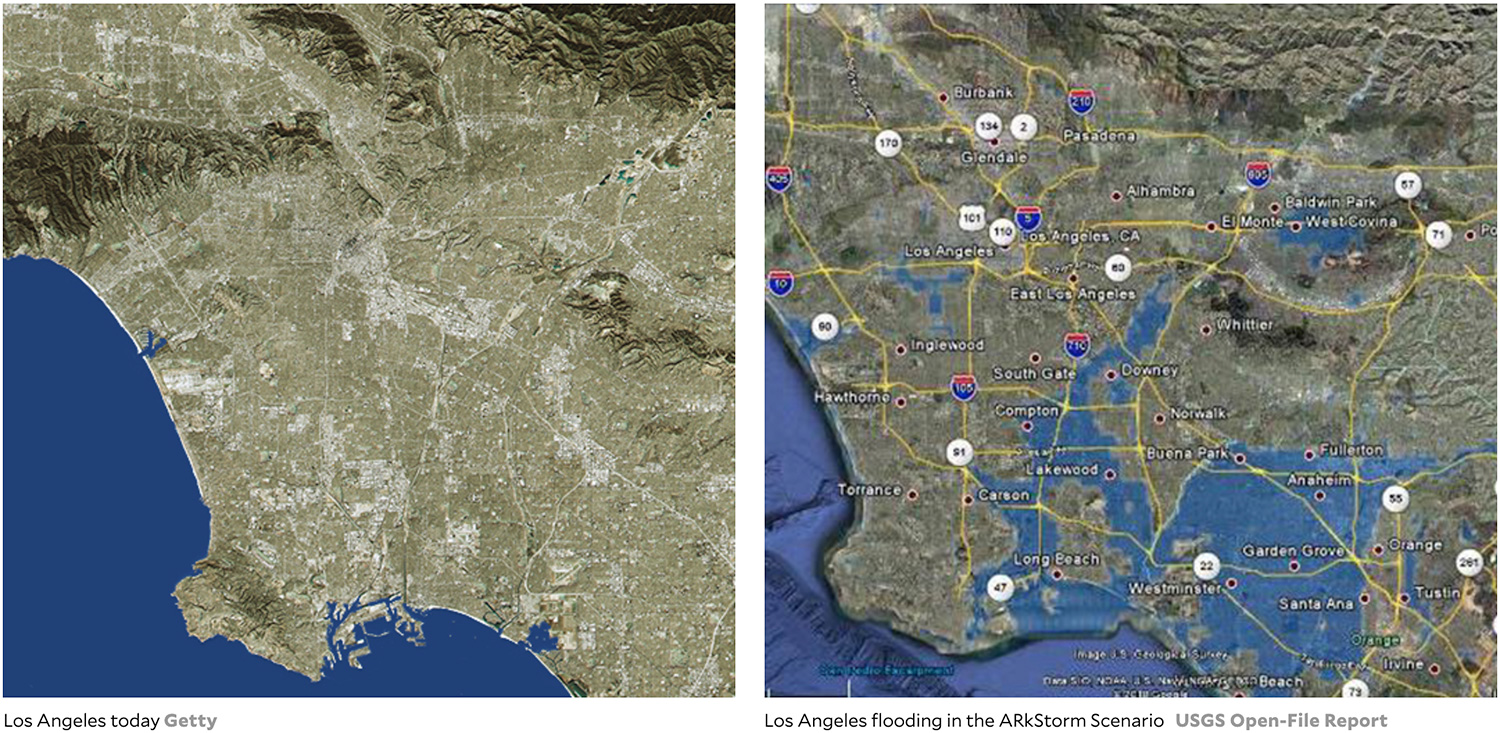 A 21st-century megastorm would fall on a region quite different from gold rush–era California. For one thing, it’s much more populous. While the ARkStorm reckoning did not estimate a death toll, it warned of a “substantial loss of life” because “flood depths in some areas could realistically be on the order of 10–20 feet.”