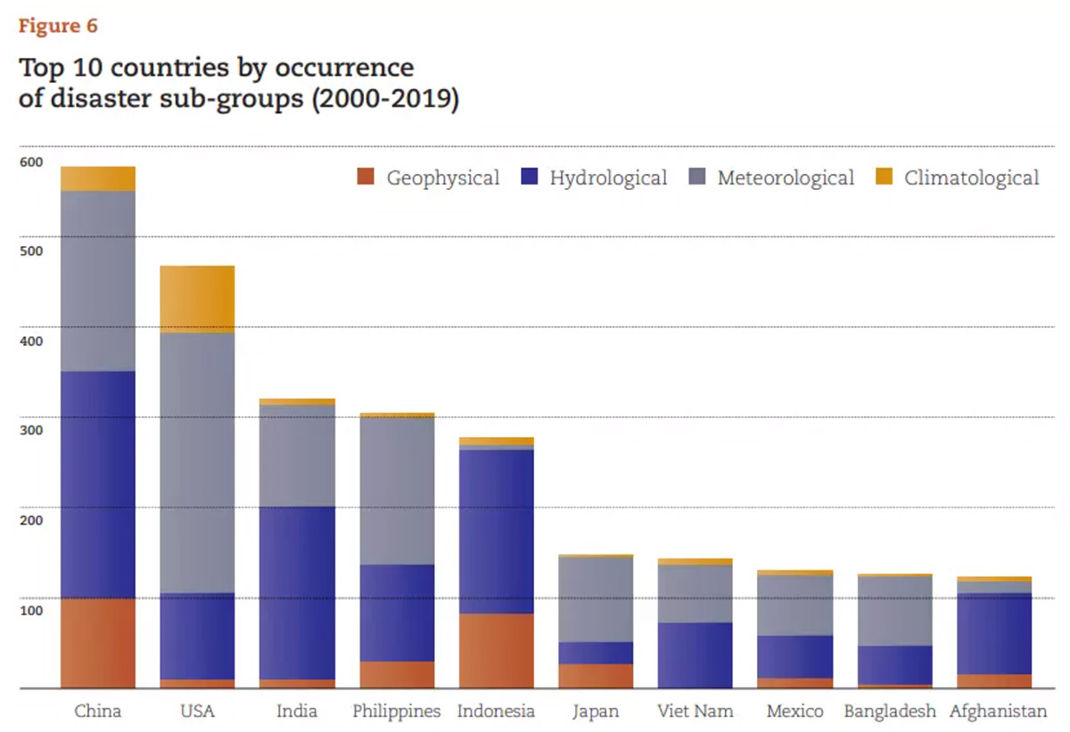 China (577) and the United States (467) recorded the highest number of disaster events from 2000 to 2019, followed by India (321), the Philippines (304) and Indonesia (278), the U.N. said in a report issued the day before the International Day for Disaster Risk Reduction. Eight of the top 10 countries are in Asia.