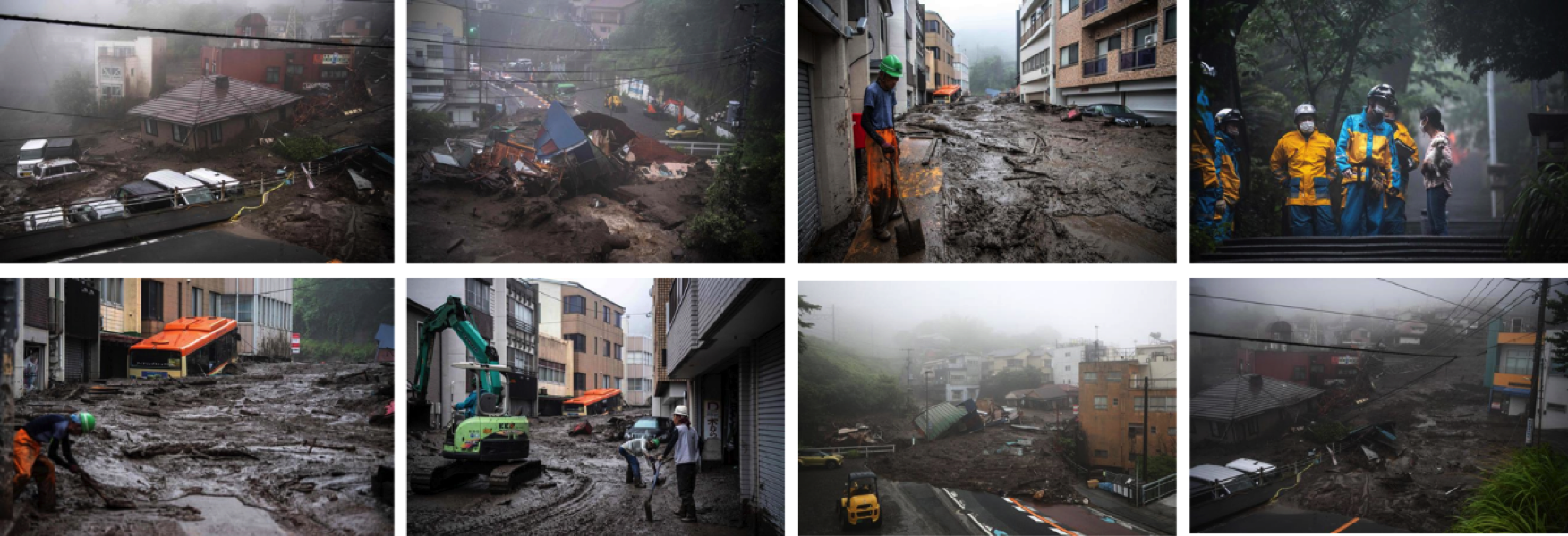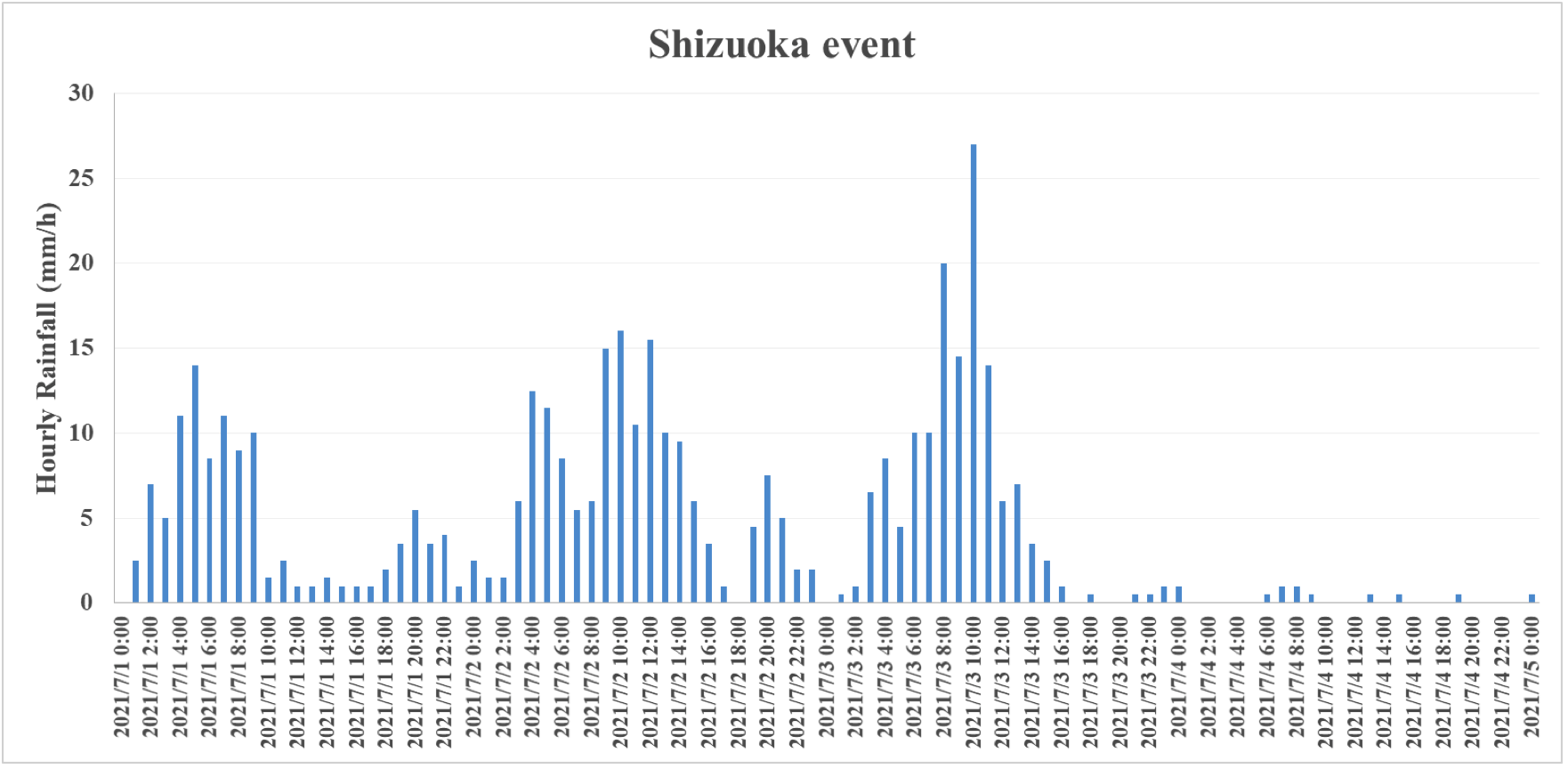According to the observation of Japan Meteorological Agency, the local continuous rainfall began on July 1st and increased on the 3rd of July. Until 12:00am on the 3rd of July, the local 48h rainfall reached 313mm, which is much more than the monthly average rainfall of July in Shizuoka. Until 17:00pm on the 3rd of July, the 72h rainfall in Atami city, Shizuoka county was 409.5mm, almost 1.7 times higher and monthly average rainfall of July in this region.