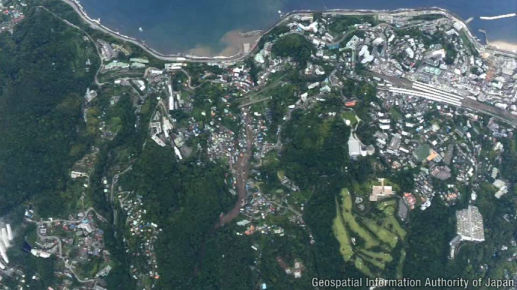 Due to continuous rainfall, a large-scale debris flow occurred in Atami city, on the morning of the July 3rd, and destroyed many houses. Moreover, the continuous rainfall has brought great difficulty to the search and rescue work. Until 5th July, the disaster has caused 9 deaths, 130 houses have been washed away. An aerial photo shows the scale of the mudslides. The debris field was 160 meters wide and stretched about two kilometers to the coast.