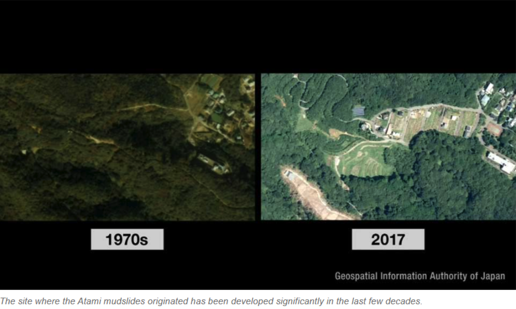 With global warming, rainstorms are increasing in Japan, resulting in more frequent landslides. For this disaster, the local officials say at least 54,000 m3 had been used to fill a valley in roughly the area where the mudslide began. That accounts for about half the amount of mud that flowed down, racing over a concrete barricade that had been built upstream and smashing into the community below.