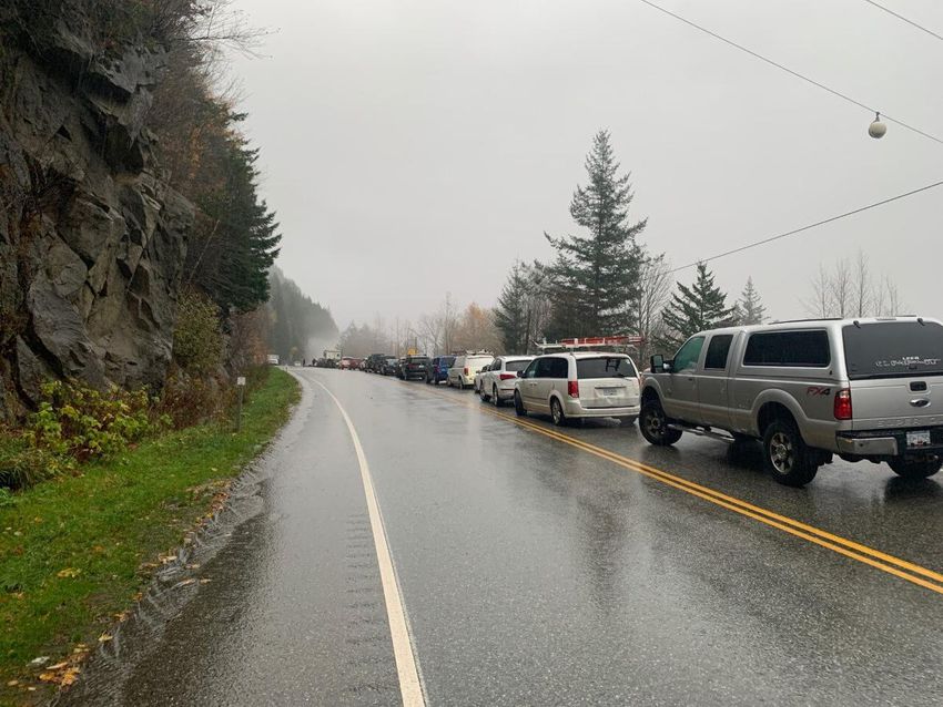 Cars sloshed slowly through a foot of water on the Malahat highway near Victoria, sending waterfalls over the edge of a collapsed highway barrier.