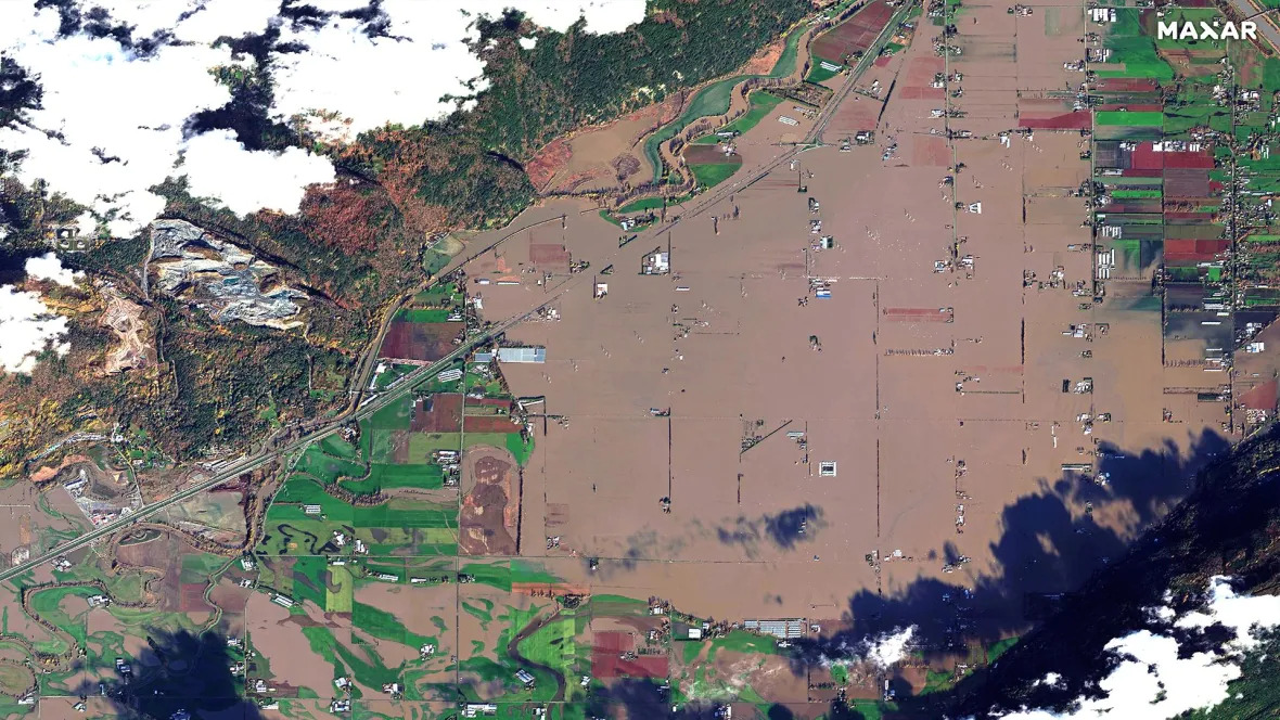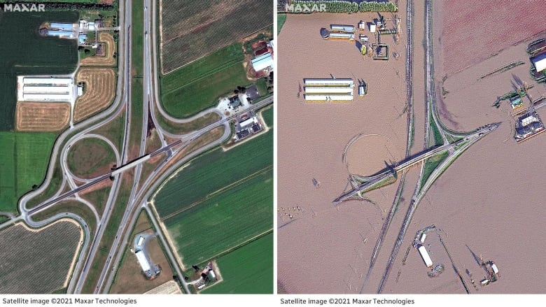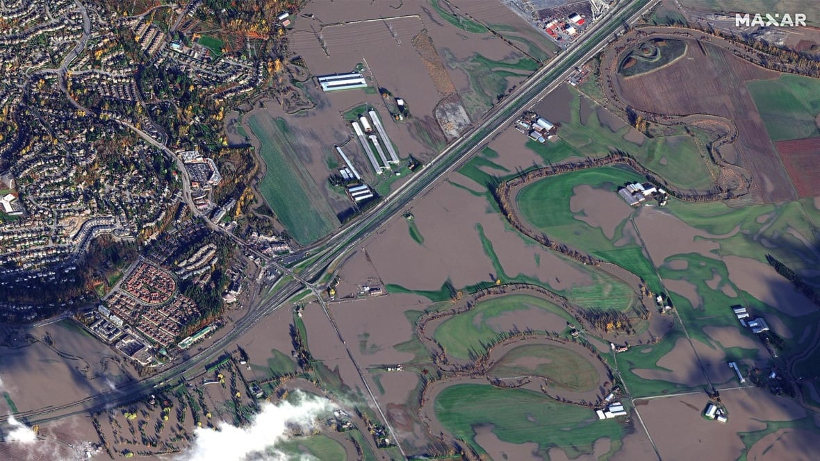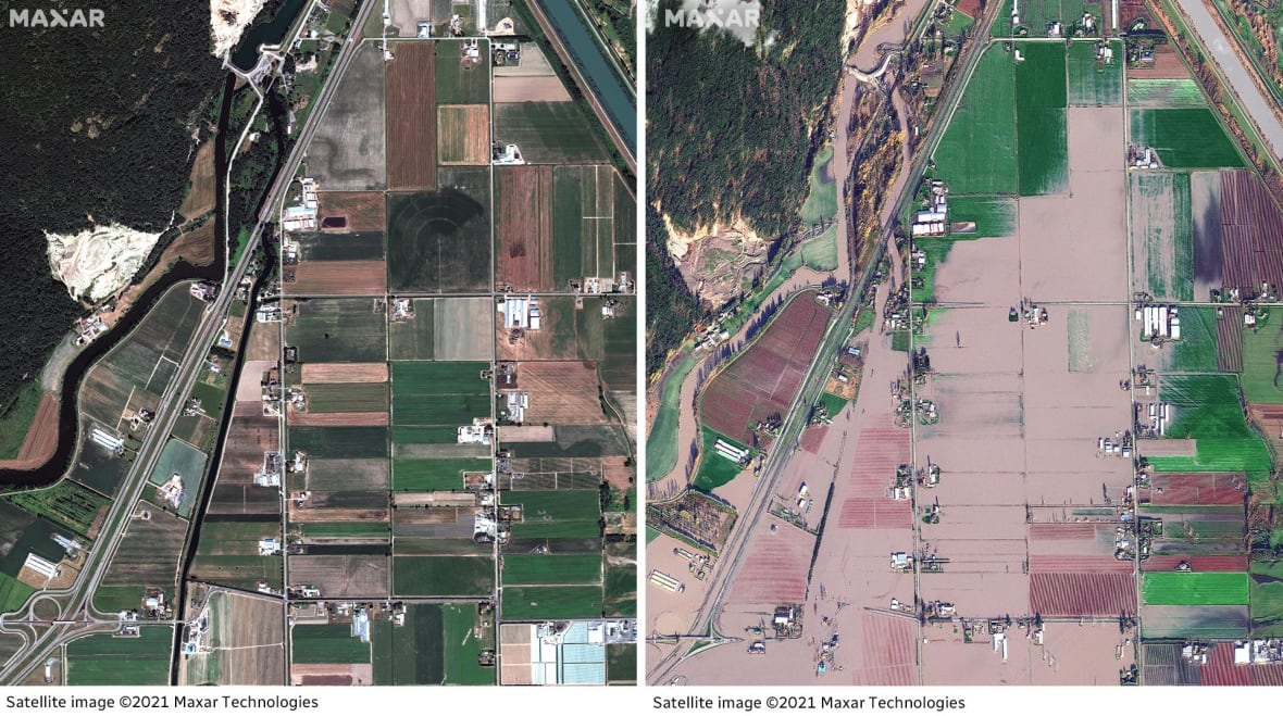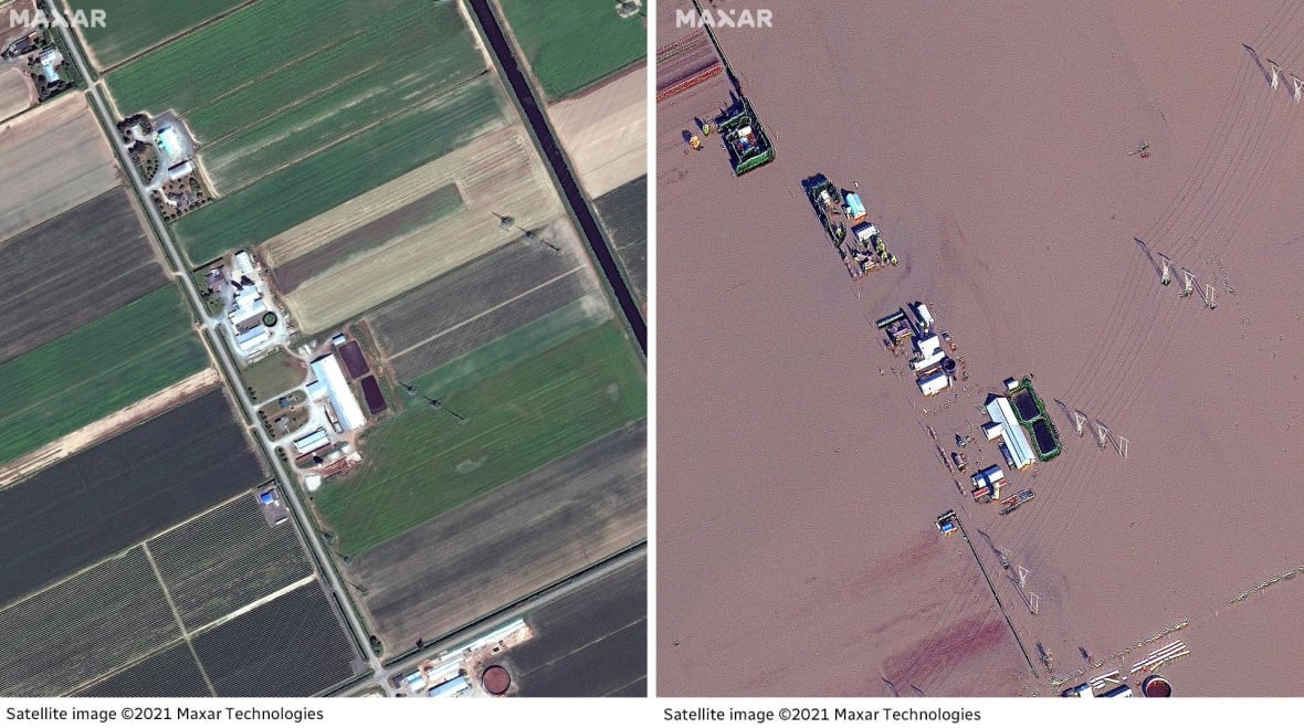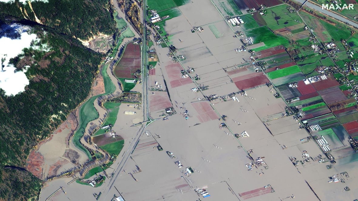 Dramatic satellite images show the extent of flood damage in B.C.'s Sumas Prairie following last weekend's historic rainfall.