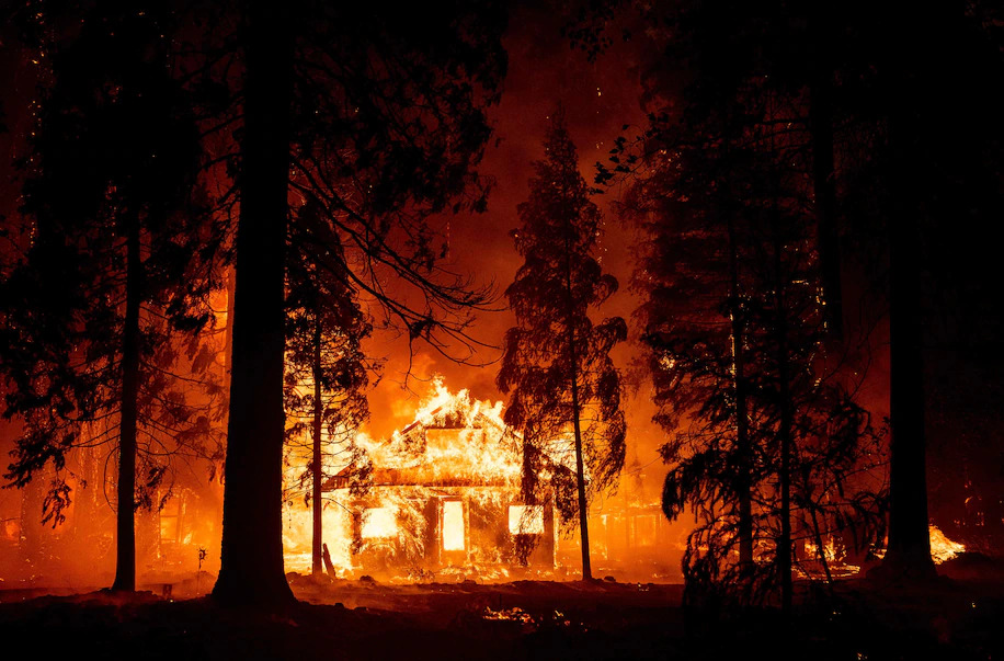 A home burns as flames from the Dixie fire tear through the Indian Falls neighborhood of unincorporated Plumas County, Calif., in July. The massive fire churned across nearly 1 million acres. (Josh Edelson/AFP/Getty Images)