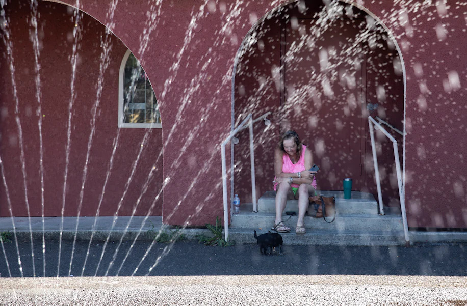 Pam Wilson, 62, sits outside with her dog Harley at the Sunrise Center cooling center in Portland, Ore., on June 27, 2021. (ALISHA JUCEVIC/For The Washington Post)