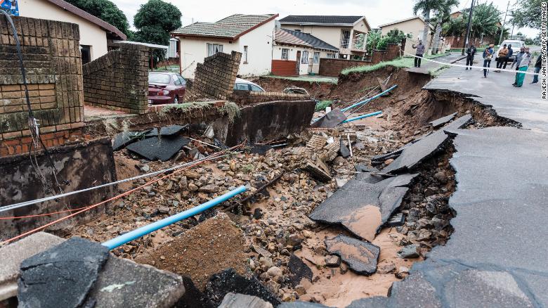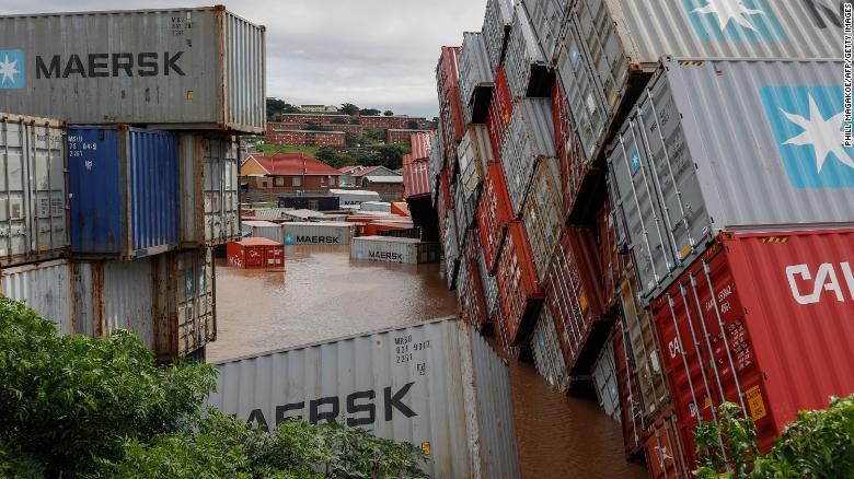 The flooding hit KwaZulu-Natal, which includes the coastal city of Durban. Roads cracked and gave way to deep fissures, and a huge stack of shipping containers collapsed into muddy waters, news agency images show.