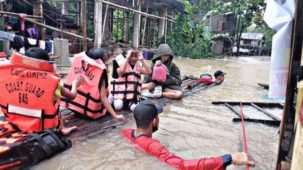 Pictures posted by the Philippines Coast Guard show rescuers carrying the injured on stretchers through chest-high water and ferrying survivors on rafts down flooded streets.