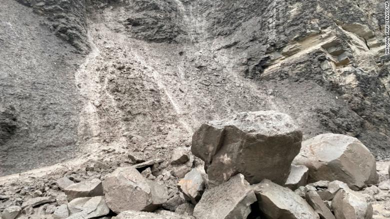 A large rockslide on North Entrance Road in Yellowstone National Park Monday.