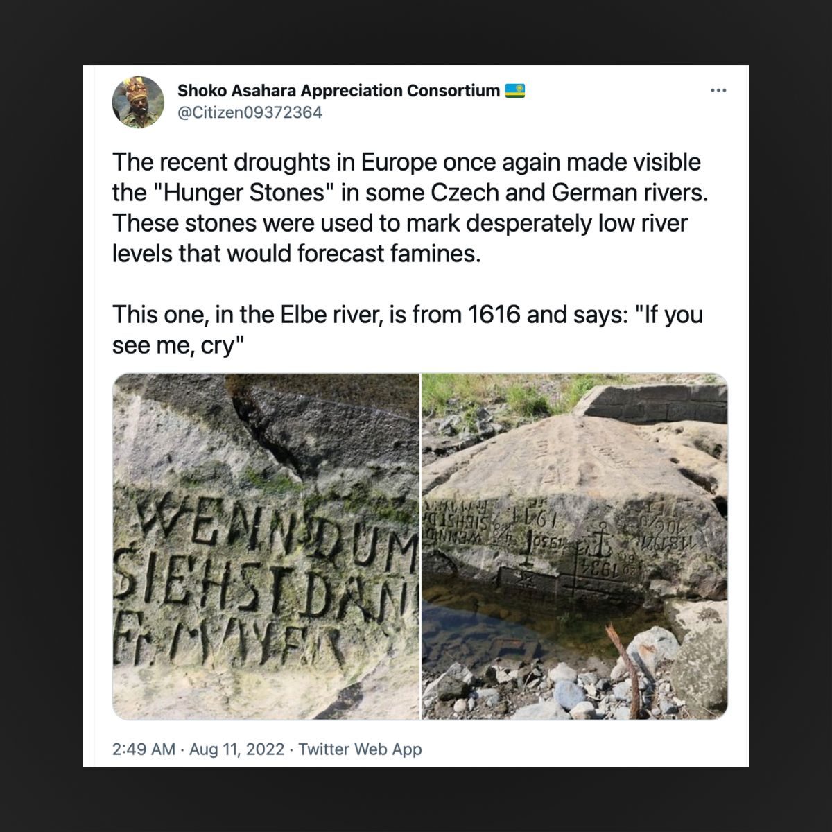 In summer 2022, one widely viewed tweet contained images of a stone in the Elbe River, in the city of Děčín, Czech Republic. The stone has a particularly dark inscription that appears to warn about famine. That quote, roughly translated to English, reads: “If you see me, cry”: