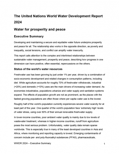 The United Nations World Water Development Report 2024 - Water for prosperity and peace